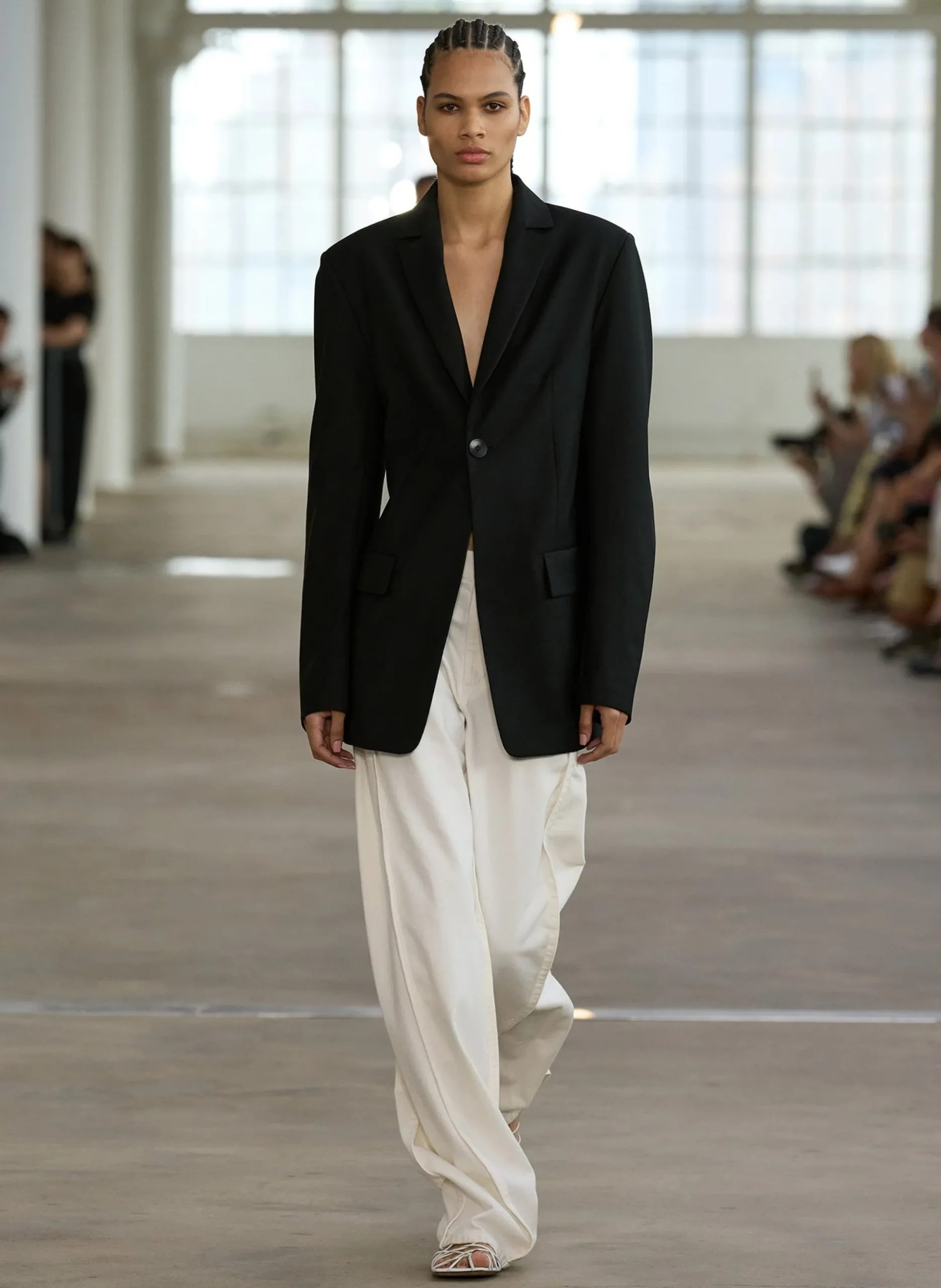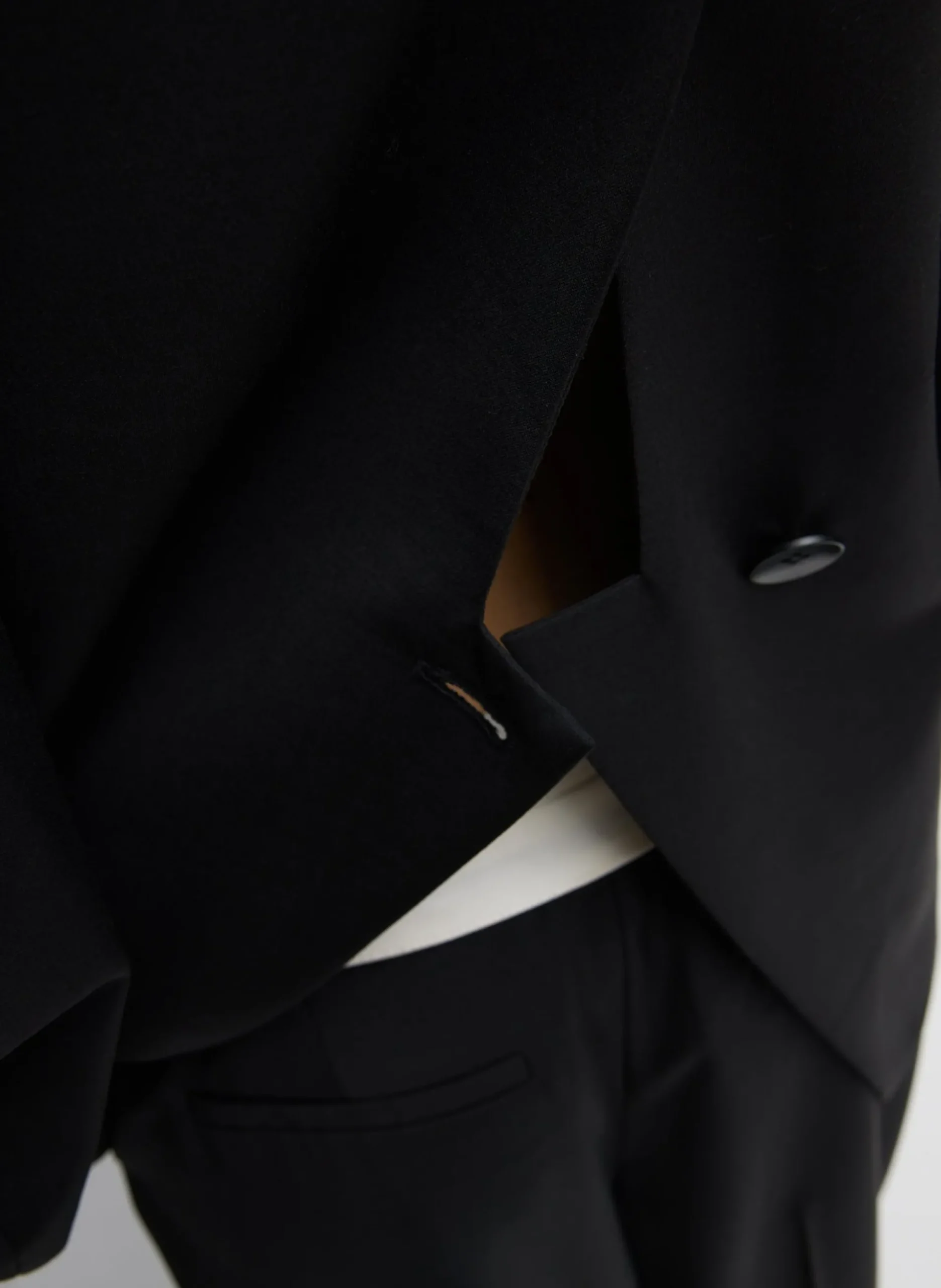 The Sculpted Sleeve Open Back Blazer is our newest iteration in our signature (Recycled) Tropical Wool fabrication. Elevated in silhouette—with sculpted sleeves reminiscent of a half moon shape—and style—with strategic button closures at the back for more outfitting permutations—this jackets simultaneously strikes equilibrium between functionality and modernity. Cross button the back for a more tailored look at the waist or leave open to achieve that good strange.
