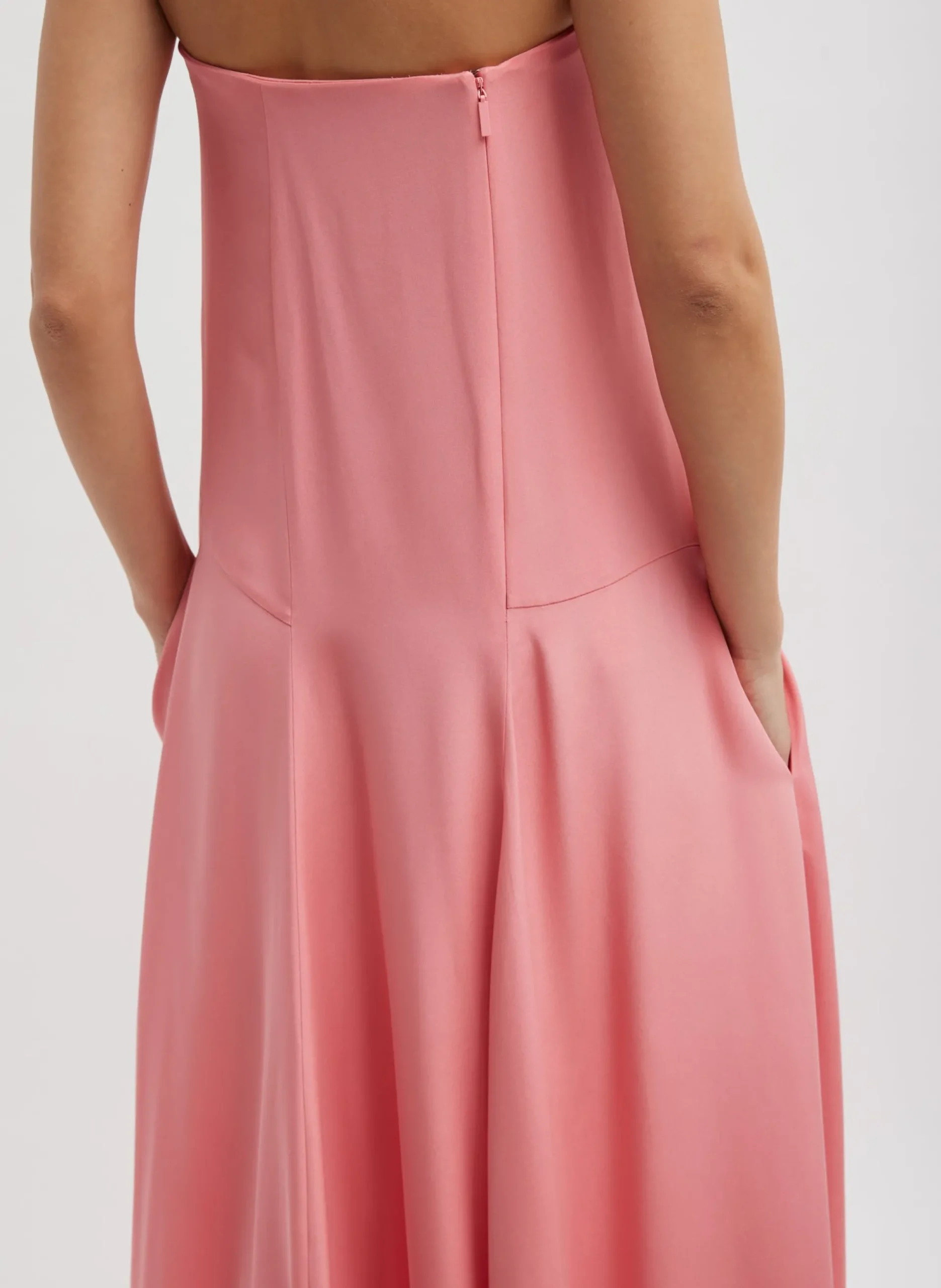 The 4-Ply Silk Strapless Sculpted Dress gets an upgrade in Pink and Dark Navy hues for Spring. With the trapezium neckline in the highest quality heavy silk, this dress will be a cocktail or casual staple that can be worn various times. Featuring an asymmetrical zipper, hook eye closure, and a built in corset. Pair with the Mikhail ballet flat for just a touch of glitz to amp up an already streamlined and modern silhouette.
