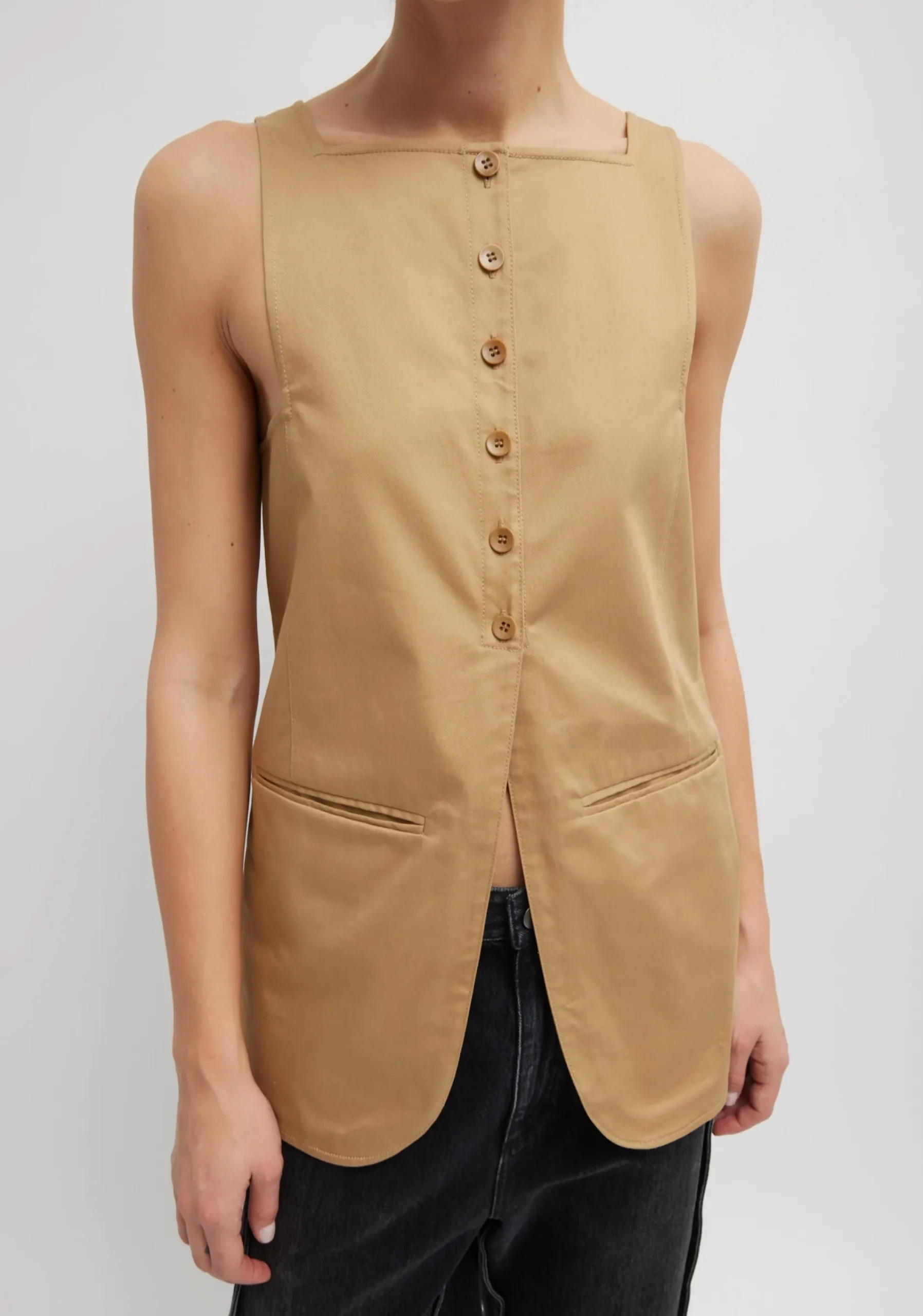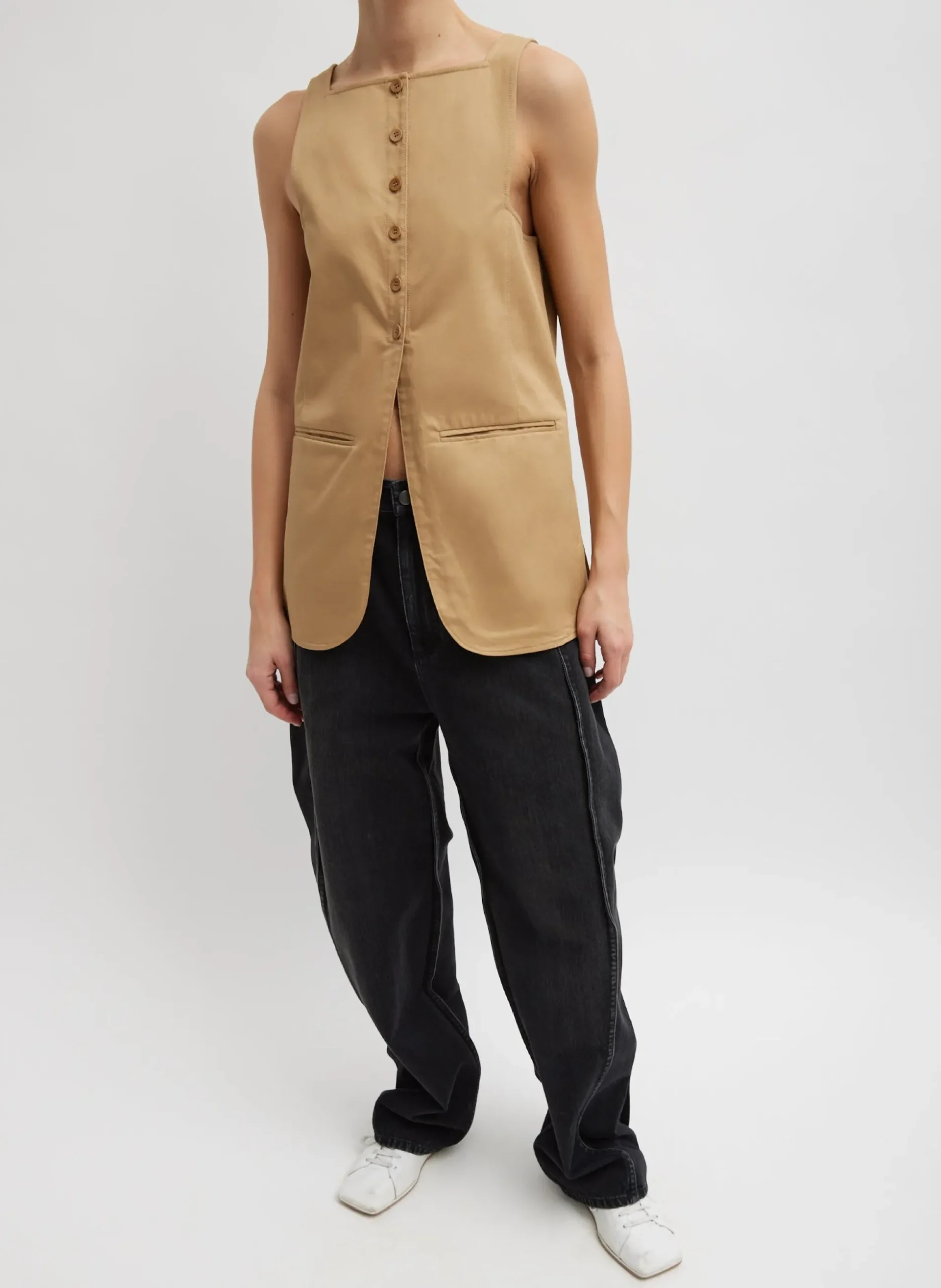Meet the Chino Slit Front Sleeveless Tunic, crafted from a Japanese compact stretch cotton chino fabrication with a twill weave, this tunic top offers the perfect blend of style and comfort. Featuring a button slit front closure and a classic square neckline for an extra touch of interest, available in Tan and White, ensuring it meets all your wardrobe needs and becomes a must-have for any CP’s rotation. Pair back to the Tropical Wool Folded Waistband Trouser for a polished look for the Spring.