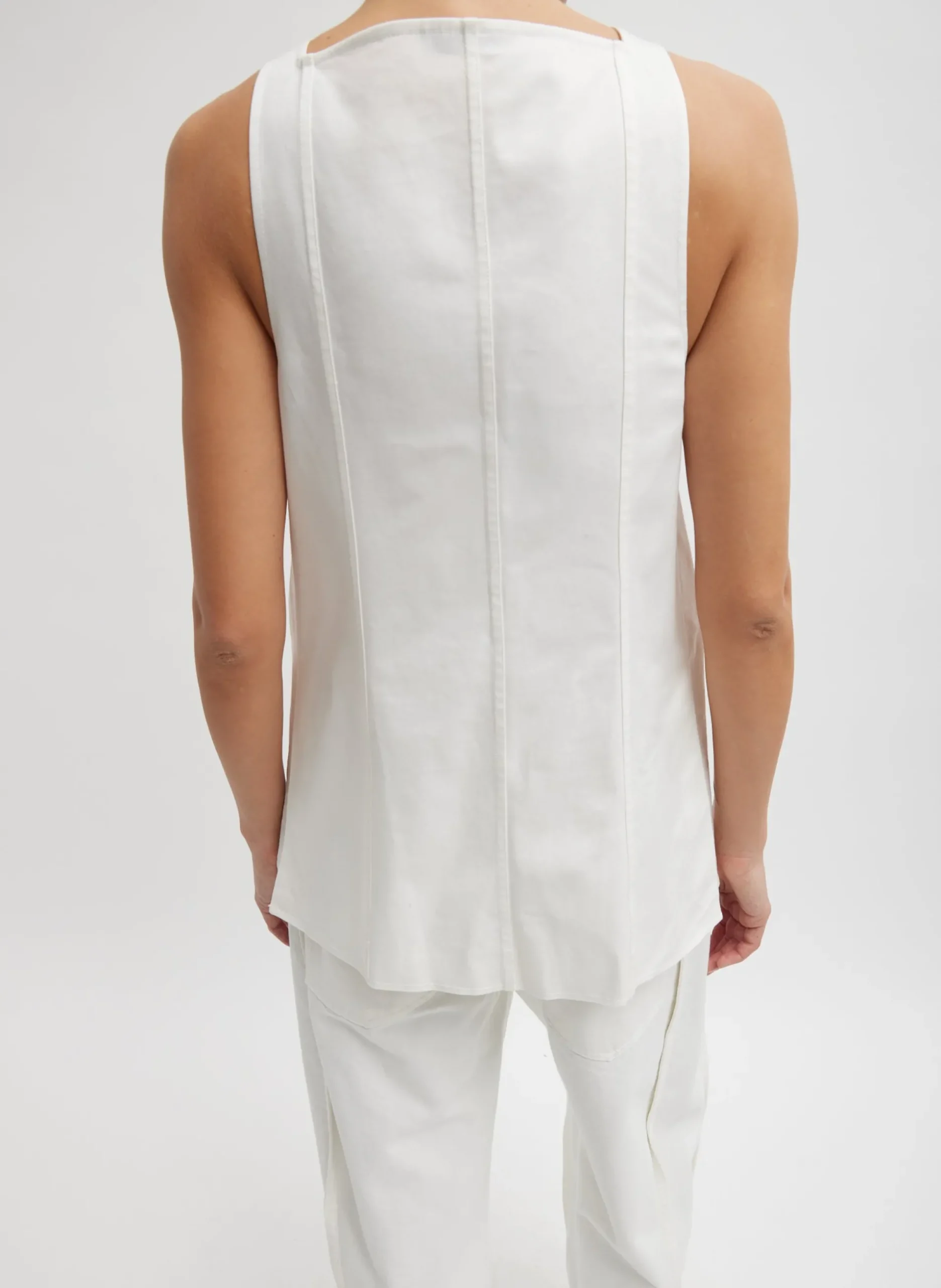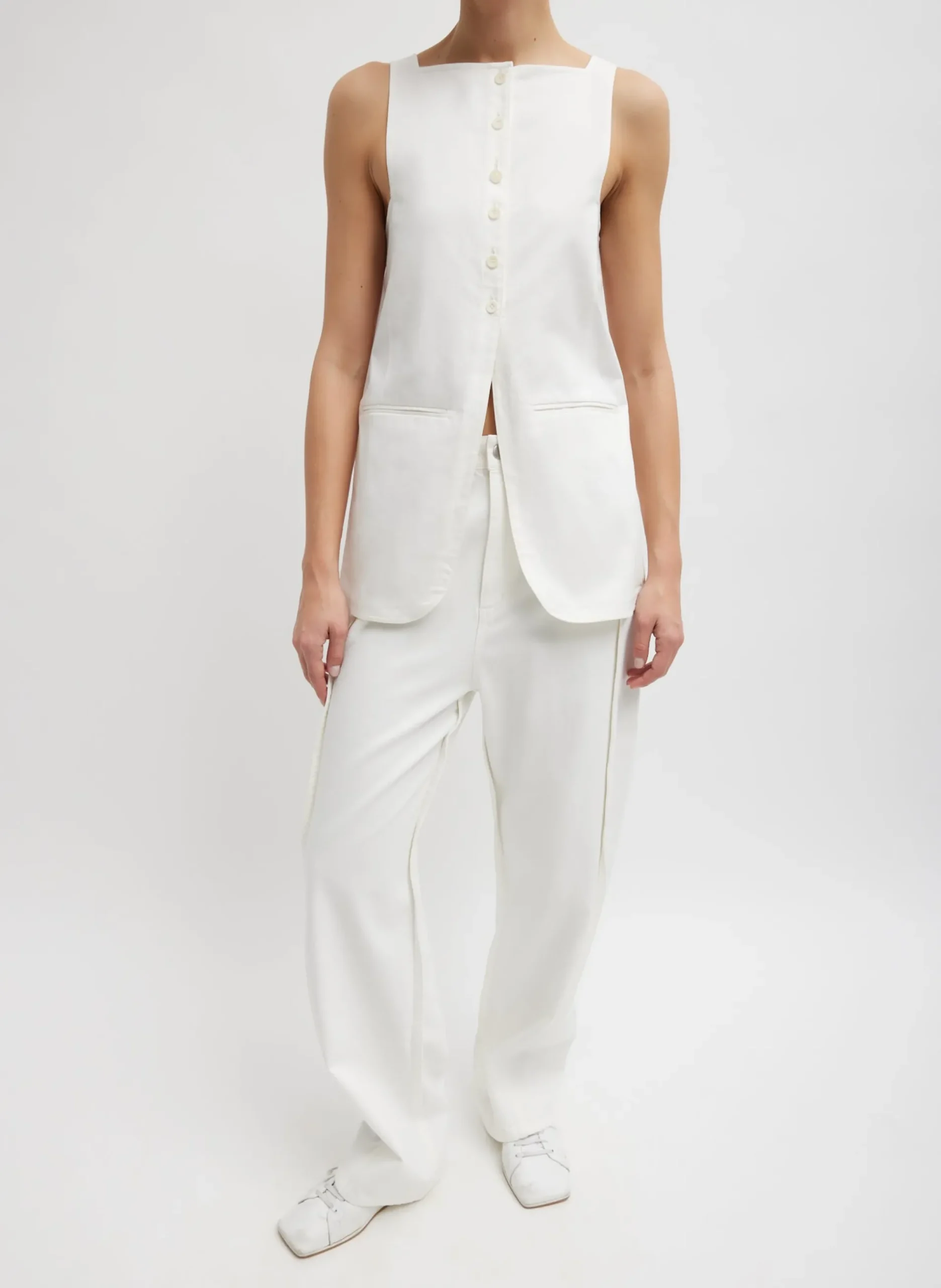 Meet the Chino Slit Front Sleeveless Tunic, crafted from a Japanese compact stretch cotton chino fabrication with a twill weave, this tunic top offers the perfect blend of style and comfort. Featuring a button slit front closure and a classic square neckline for an extra touch of interest, available in Tan and White, ensuring it meets all your wardrobe needs and becomes a must-have for any CP’s rotation. Pair back to the Tropical Wool Folded Waistband Trouser for a polished look for the Spring.