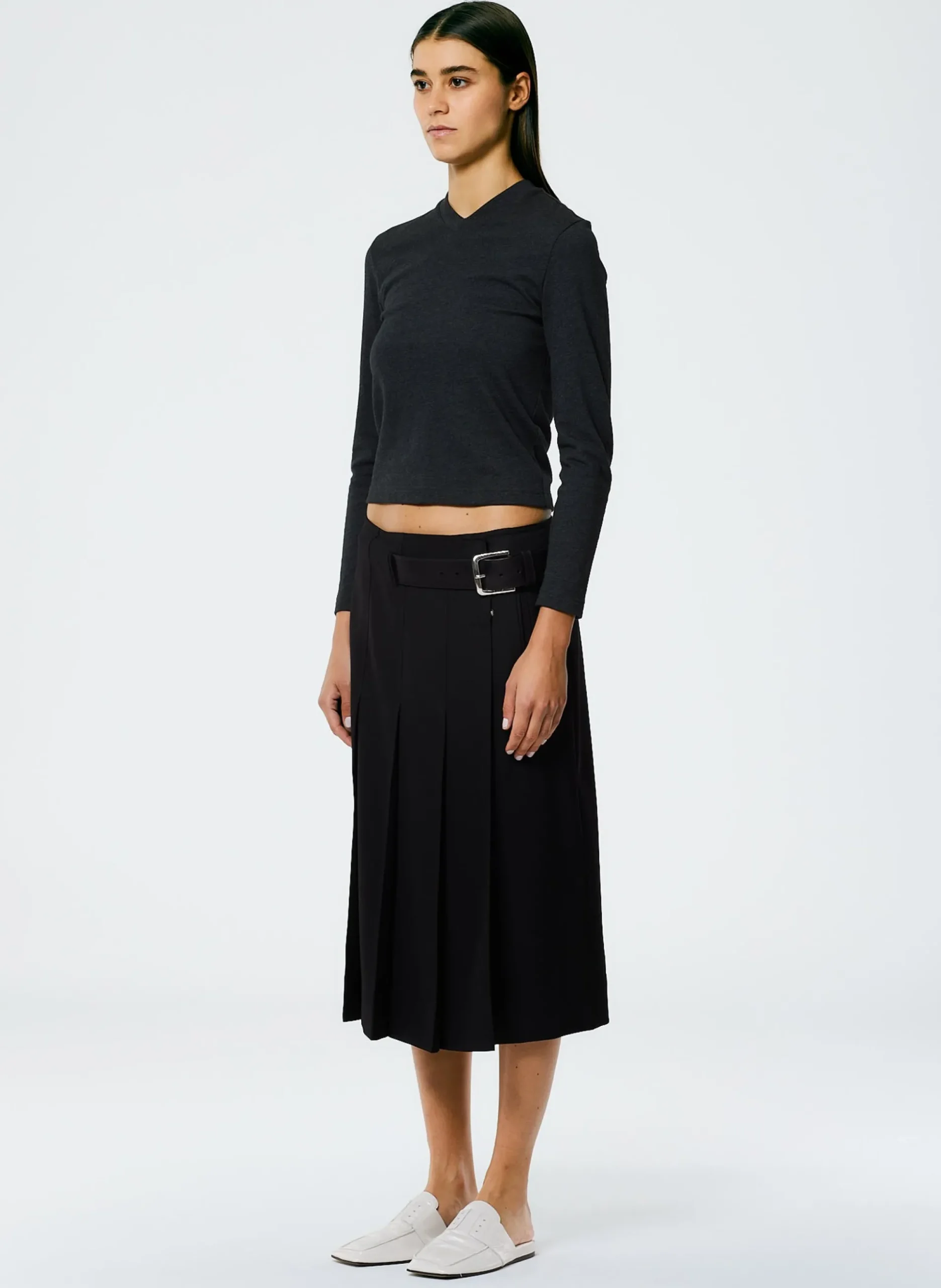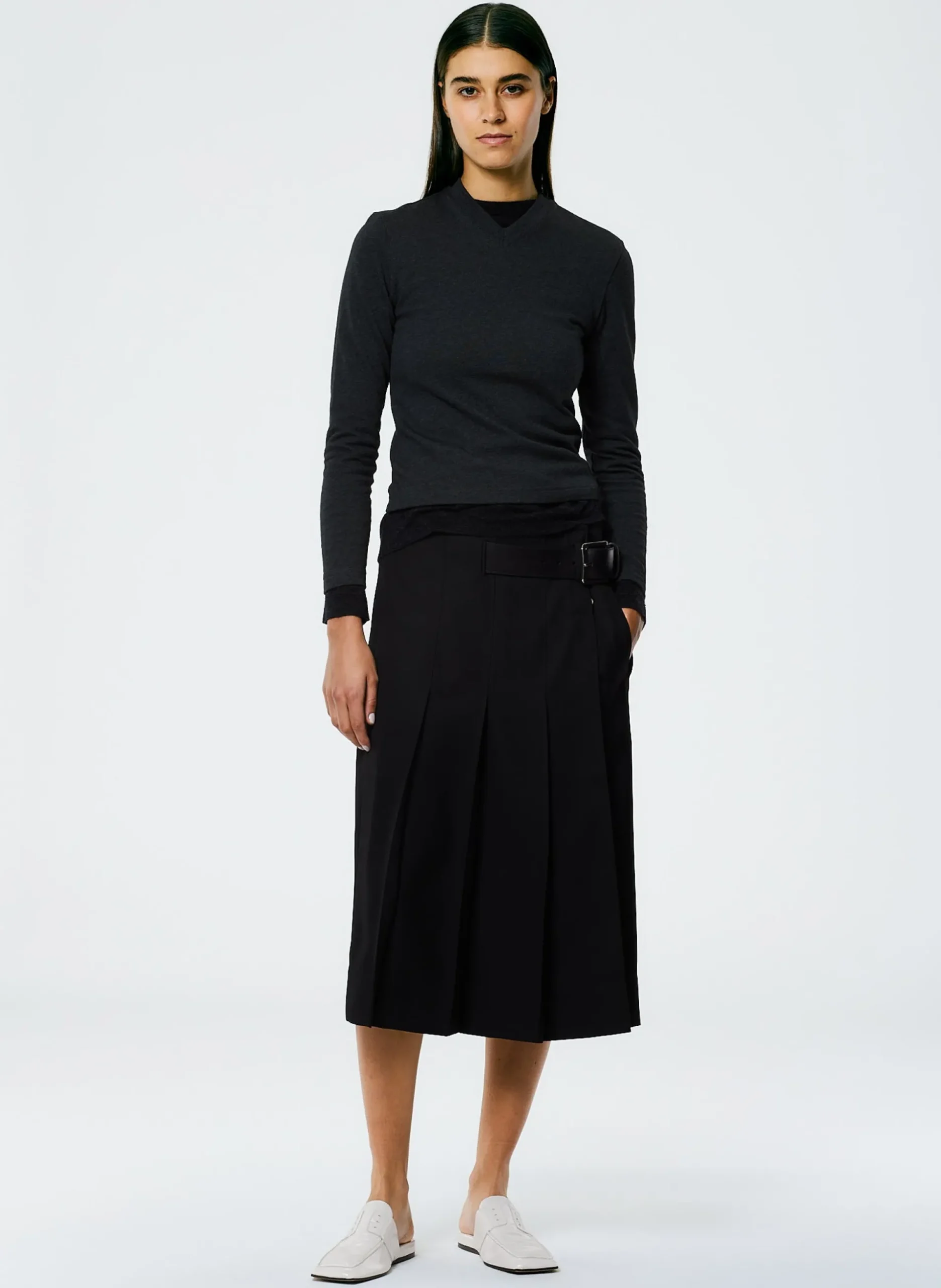 A key transitional piece, the Grain de Poudre Wide Pleat Wrap Skirt is meticulously crafted from 100% virgin wool with a superfine basket weave texture for a style that is not just luxurious, but long-lasting. Featuring a knife pleating detail and adjustable closure with a built in leather belt, this thoughtfully engineered style is a familiar take on a Tibi classic, further elevating the idea of what a WOF skirt can and should be. This skirt’s versatility allows for optimal outfit experimentation: pair back to its matching Liam Blazer with Slit Details and the Active Knit Slim Sporty Top for the perfect CMC balance.