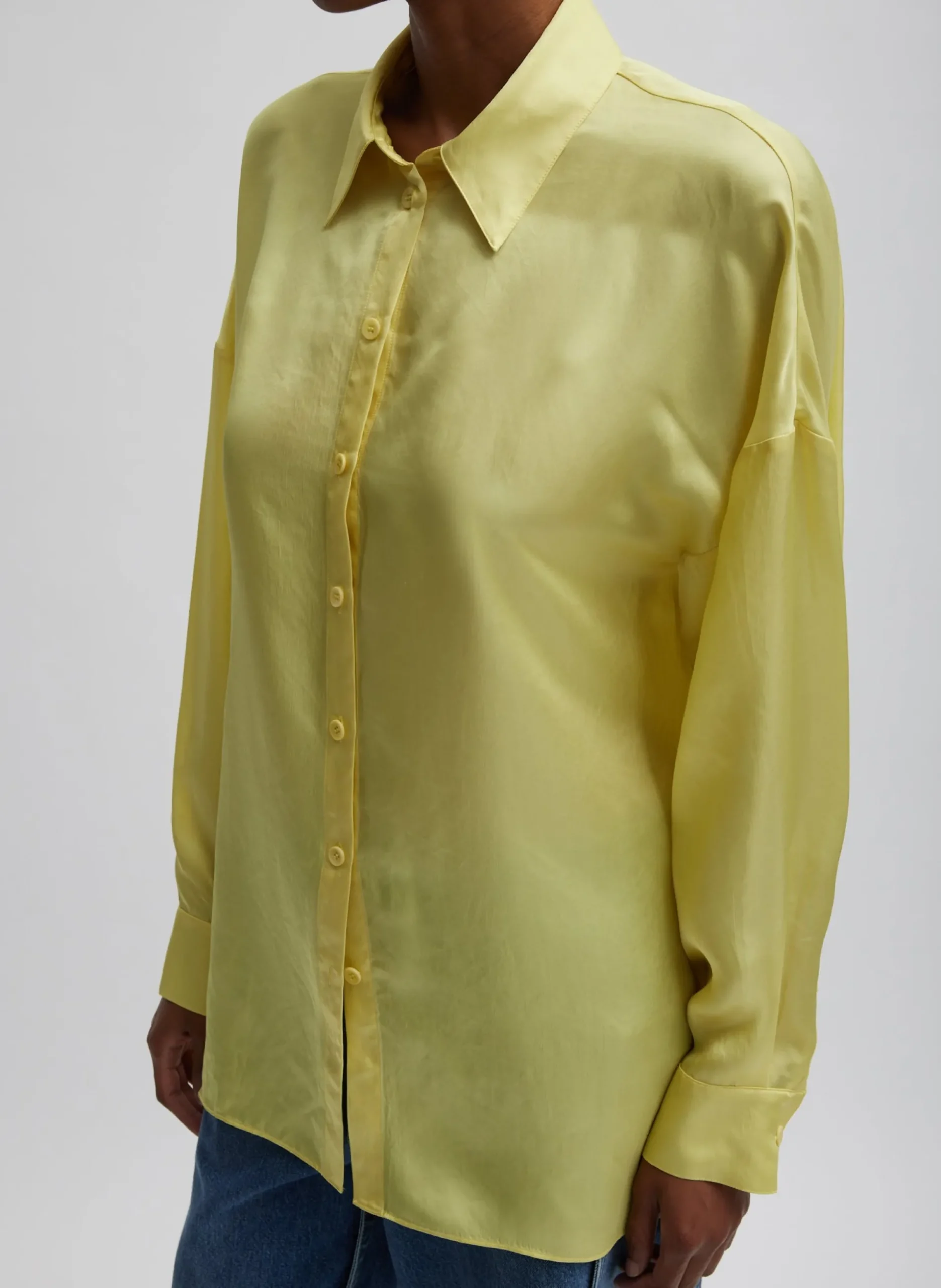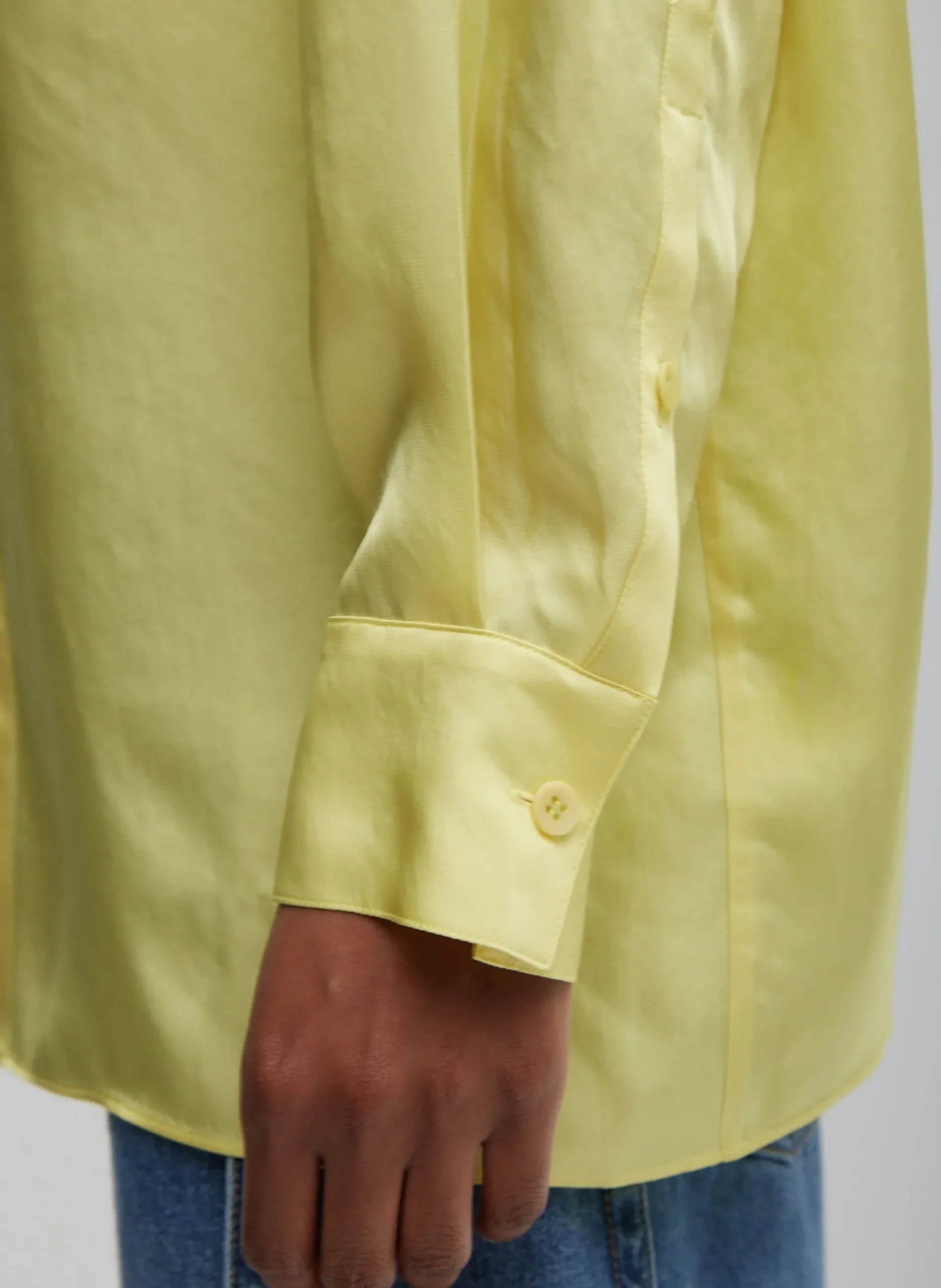The Spring Acetate Shirt with Cocoon Back crafted from a Japanese lightweight twill weave with drapey detailing making it the perfect PDW piece to add to your rotation for all year wear. – Featuring our classic cocoon back silhouette but in a new iteration. Available in three impactful colorways— Dark Navy, Pale Lavender, and Yellow giving you unlimited styling opportunities. Pair back to the Tuck Jean or the Silk Nylon pull on short and Mikhail flat for a casual take on this top.