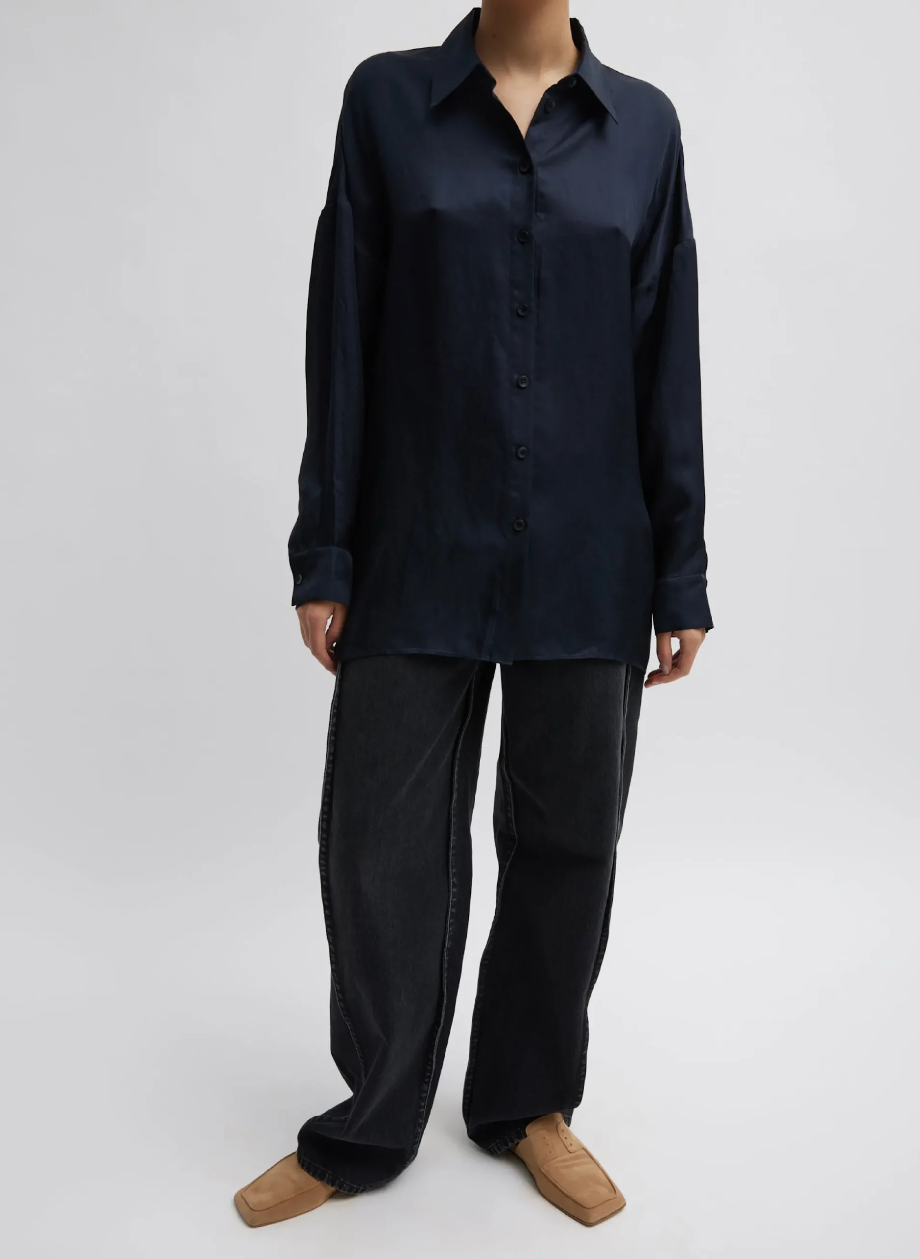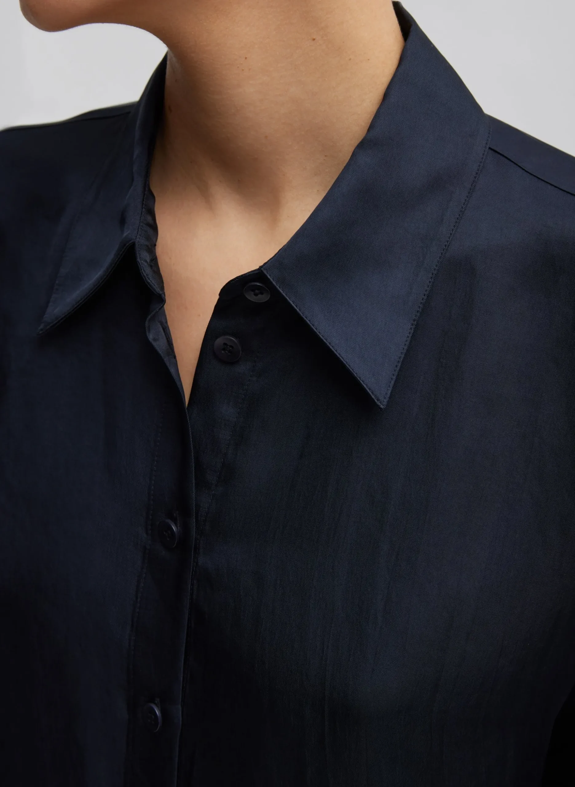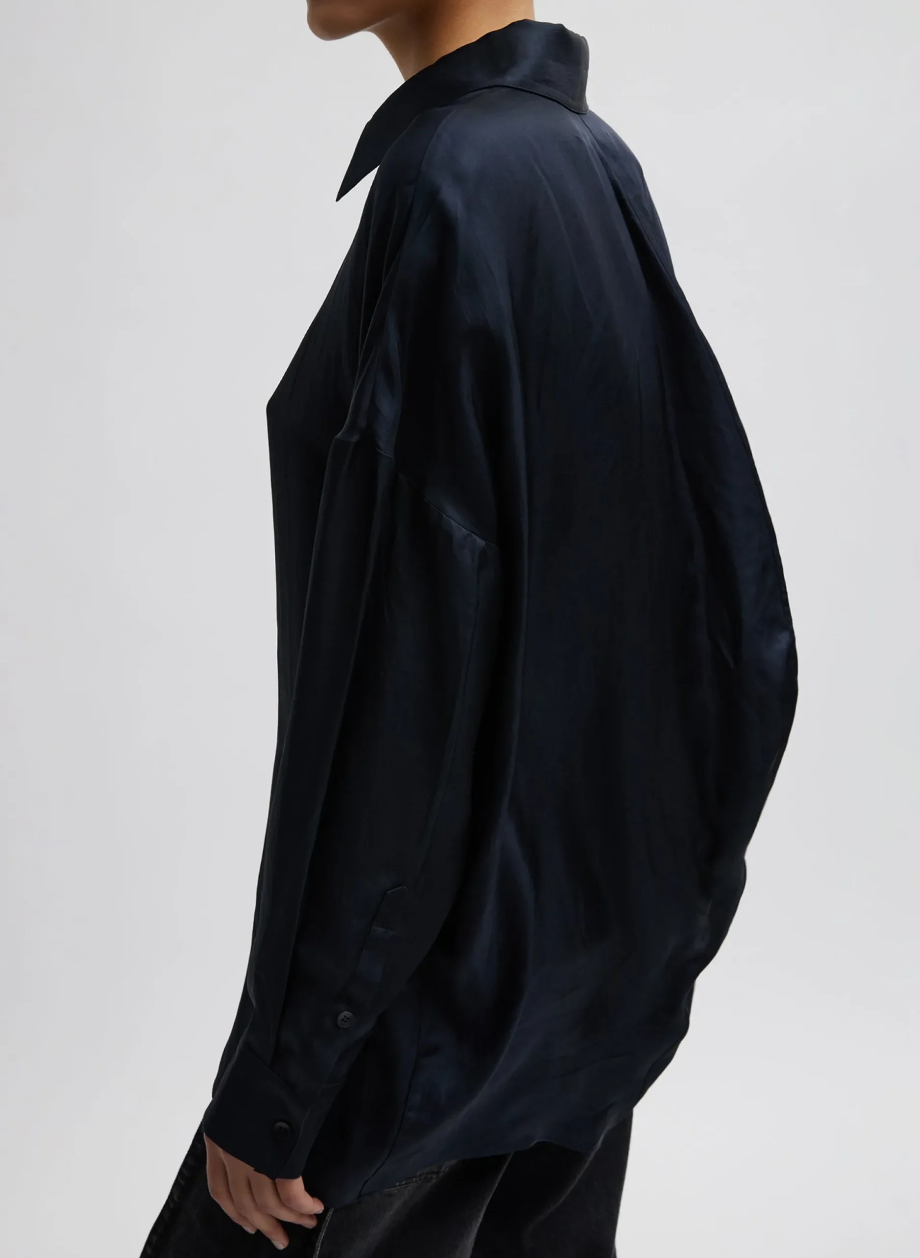 The Spring Acetate Shirt with Cocoon Back crafted from a Japanese lightweight twill weave with drapey detailing making it the perfect PDW piece to add to your rotation for all year wear. – Featuring our classic cocoon back silhouette but in a new iteration. Available in three impactful colorways— Dark Navy, Pale Lavender, and Yellow giving you unlimited styling opportunities. Pair back to the Tuck Jean or the Silk Nylon pull on short and Mikhail flat for a casual take on this top.